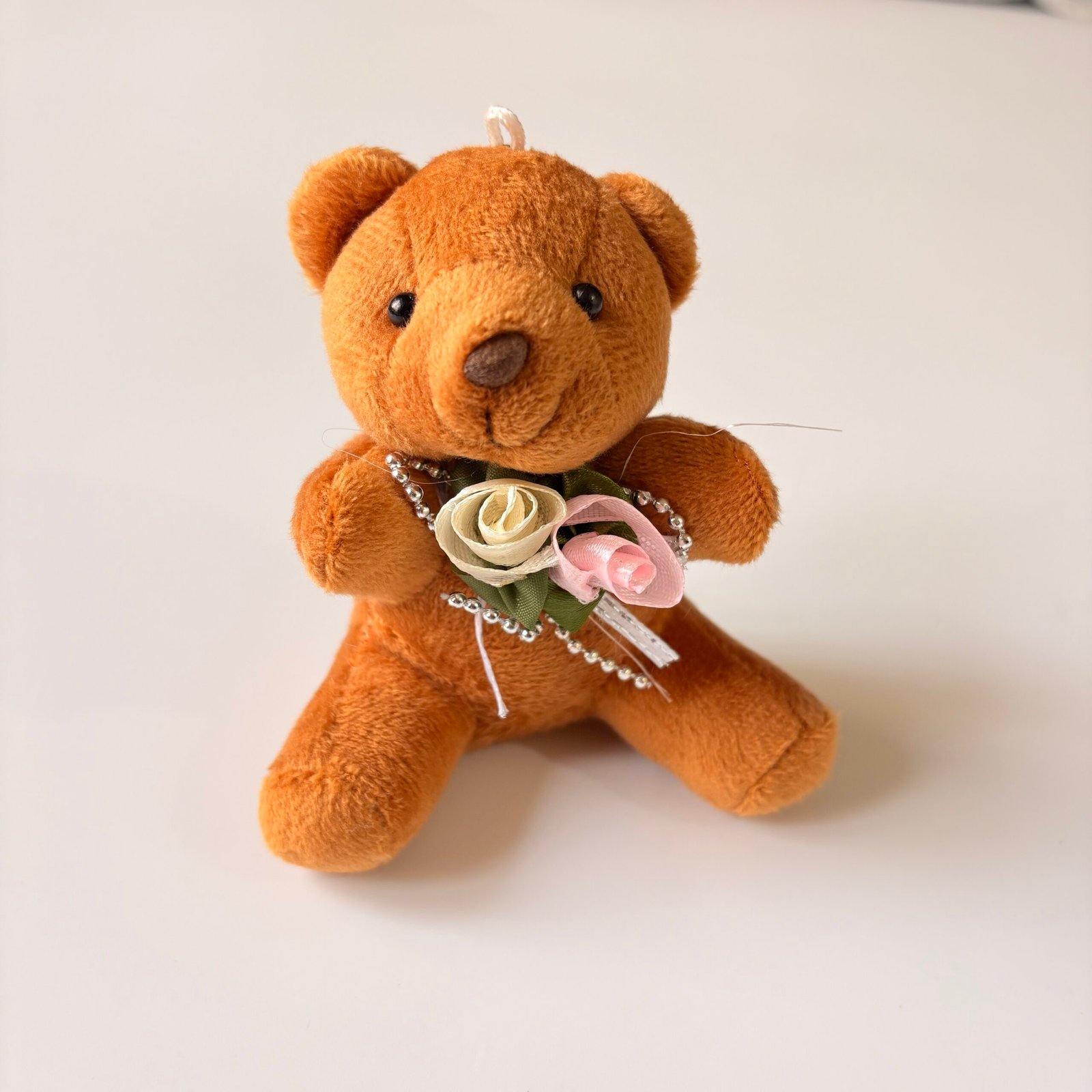 A warm brown bear holding a light pink rose.