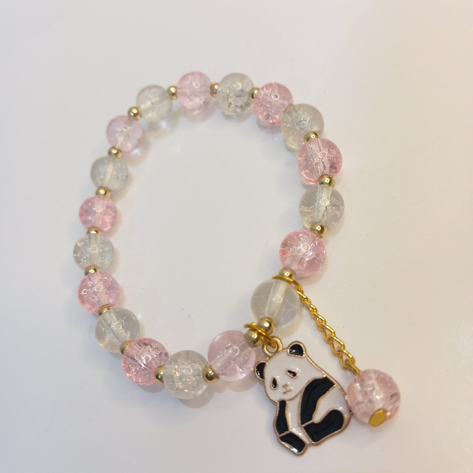 Pink and White Crystal Bracelet with Metal Cute Sitting Panda Charm