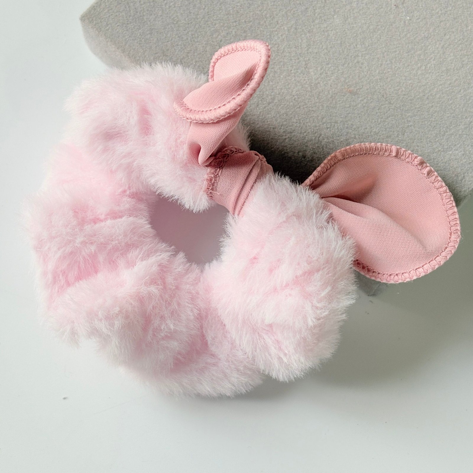 Sweet Pink Fuzzy Scrunchie with Bow Knot Ears – Soft Faux Fur Ponytail Holder